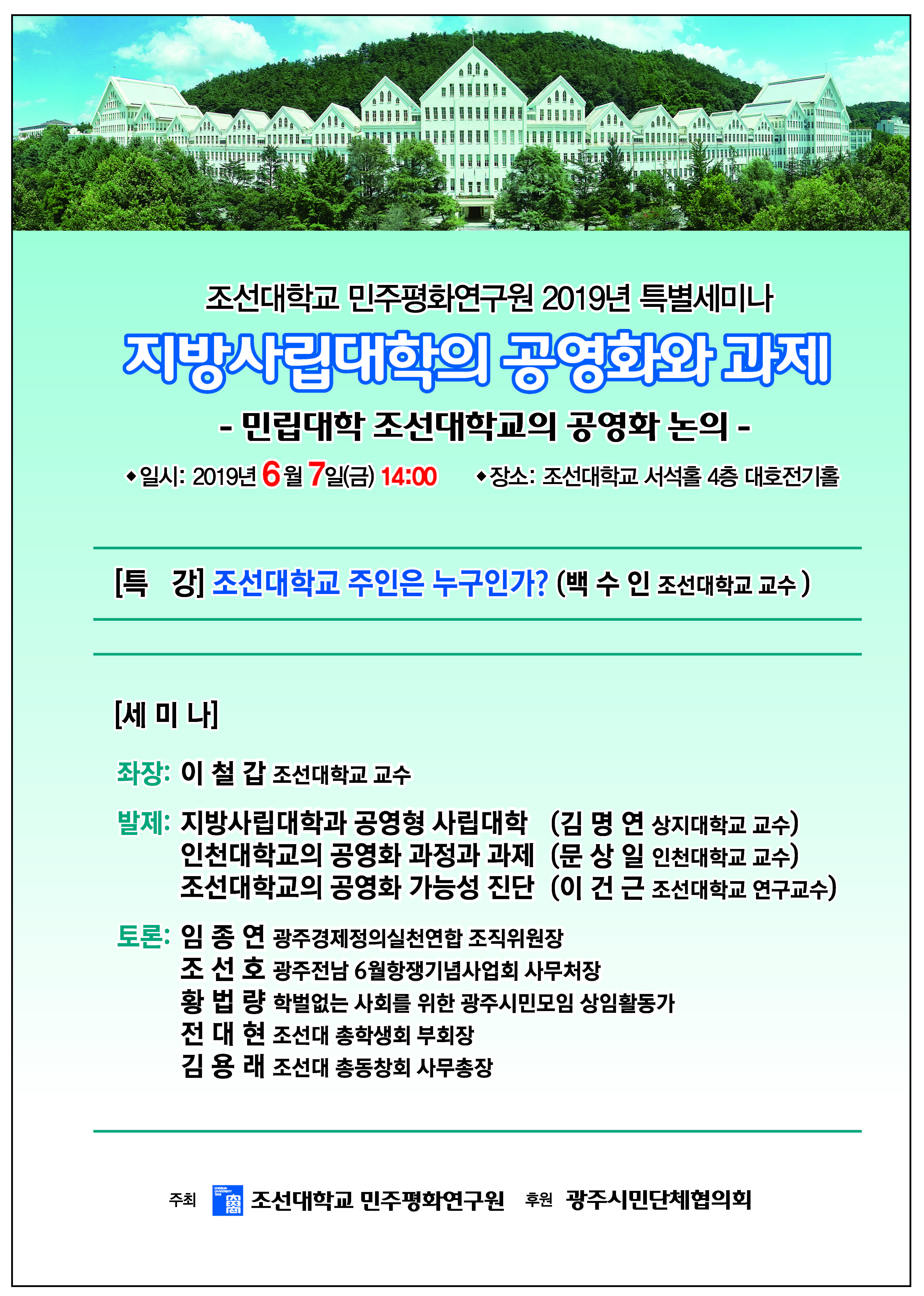 조선대학교 민주평화연구원 주최 "지방사립대학의 공영화와 과제" 행사에 황법량 상임활동가가 토론 발표자로 참석합니다.