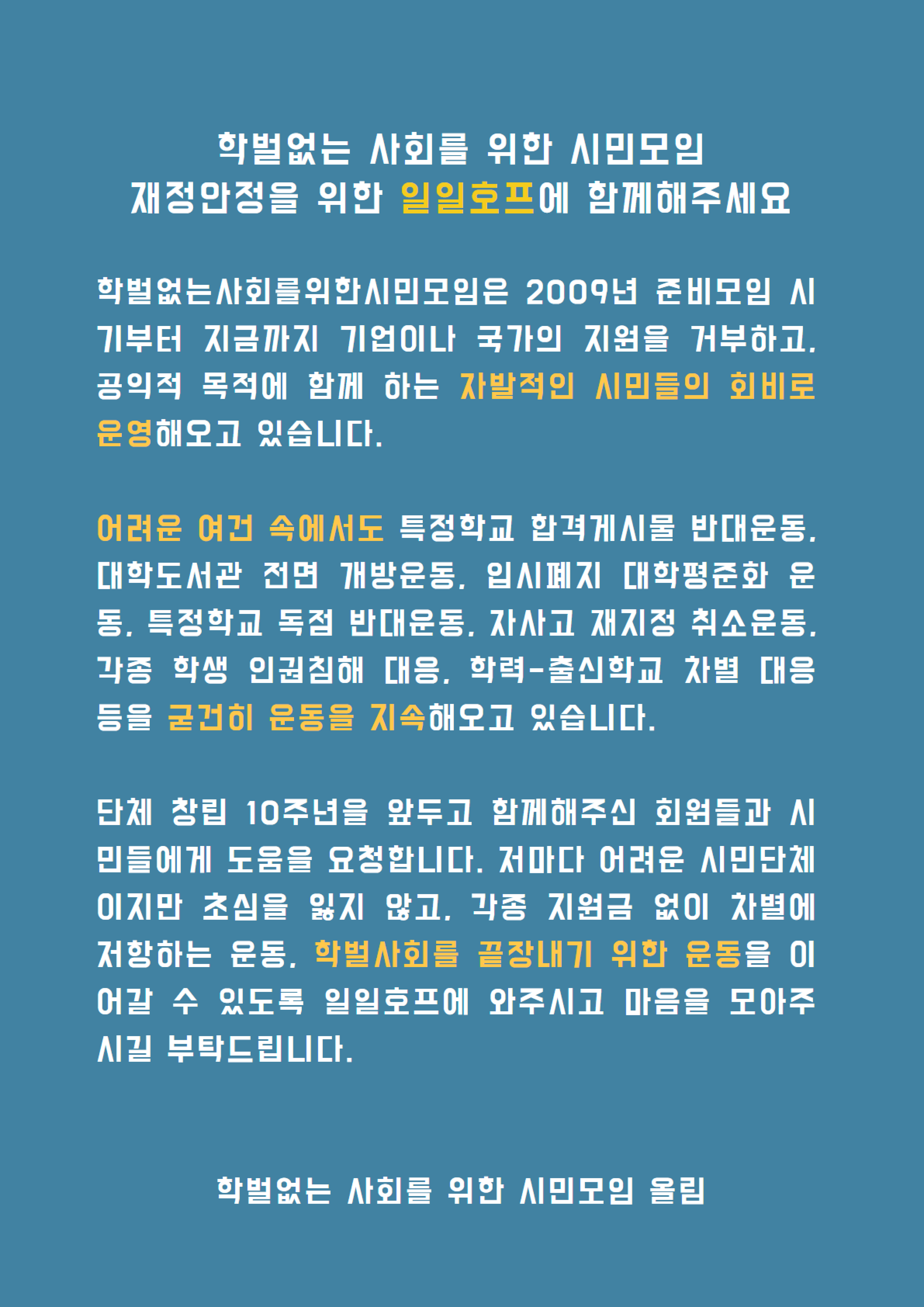 단체 창립 10주년을 앞두고 함께해주신 회원들과 시민들에게 도움을 요청합니다. 저마다 어려운 시민단체이지만 초심을 잃지 않고, 각종 지원금 없이 차별에 저항하는 운동, 학벌사회를 끝장내기 위한 운동을 이어갈 수 있도록 일일호프에 와주시고 마음을 모아주시길 부탁드립니다.