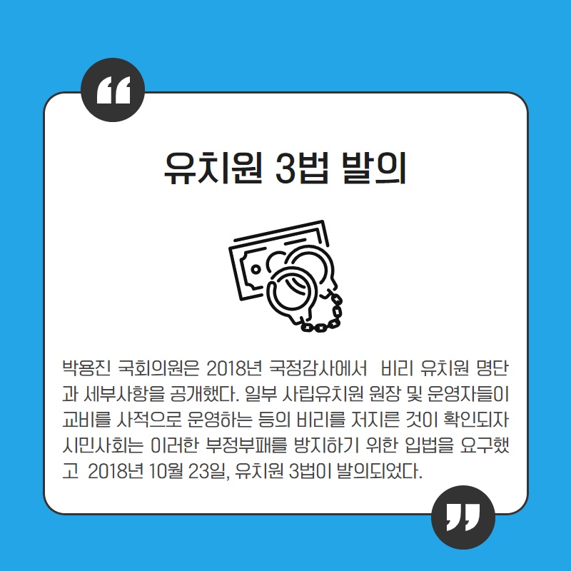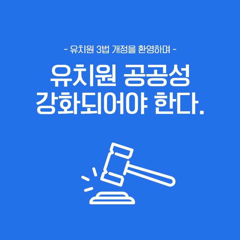 - 유치원 3법 개정을 환영하며 - ○ 2018년 사립유치원의 일부 원장 및 운영자들이 스스로의 본분과 책무를 망각한 채 사적 이익을 위하여 사립유치원을 운영하고, 회계·각종 운영 등에 관한 비리를 저지른..
