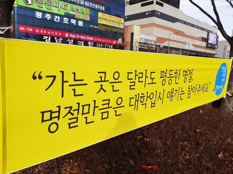 2020년 설날연휴를 맞아 대중교통 시설 인근에 명절현수막을 게첨하였습니다. "가는 곳은 달라도 평등한 명절, 명절만큼은 대학입시 얘기는 참아주세요."