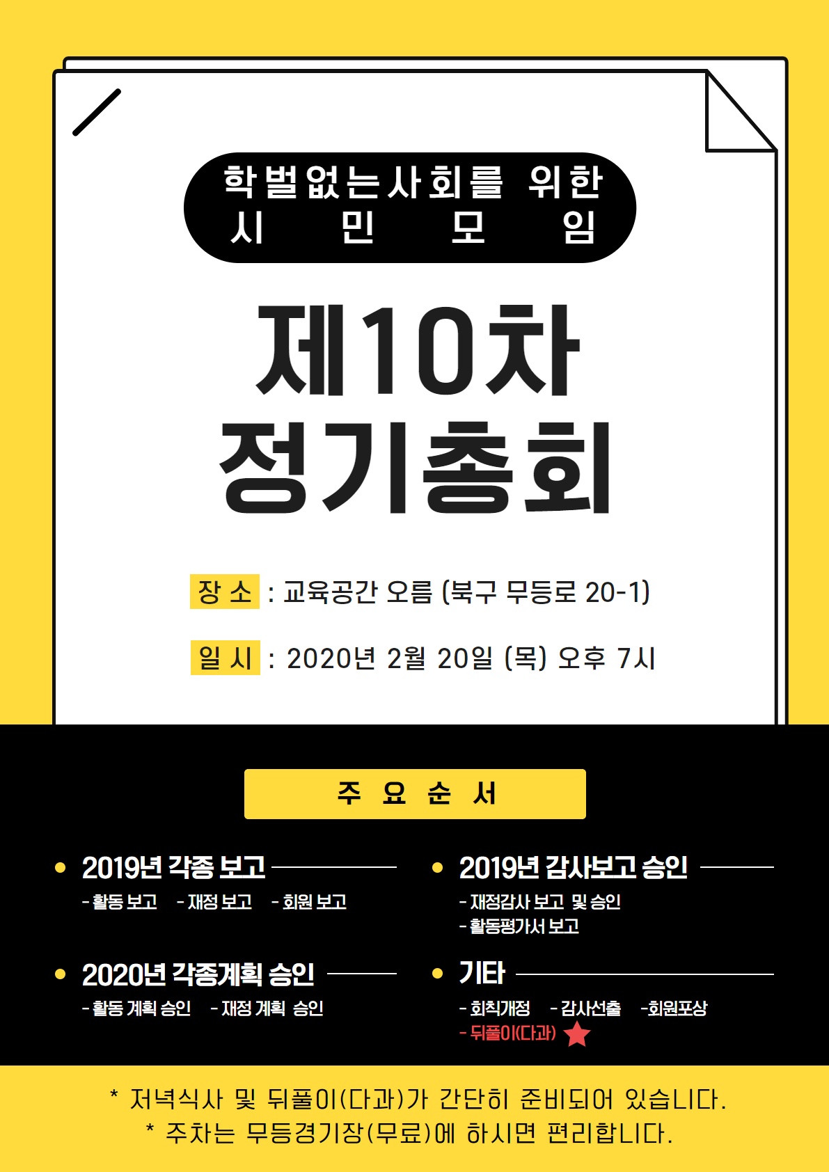 - 회칙개정, 감사선출, 회원포상, 뒤풀이