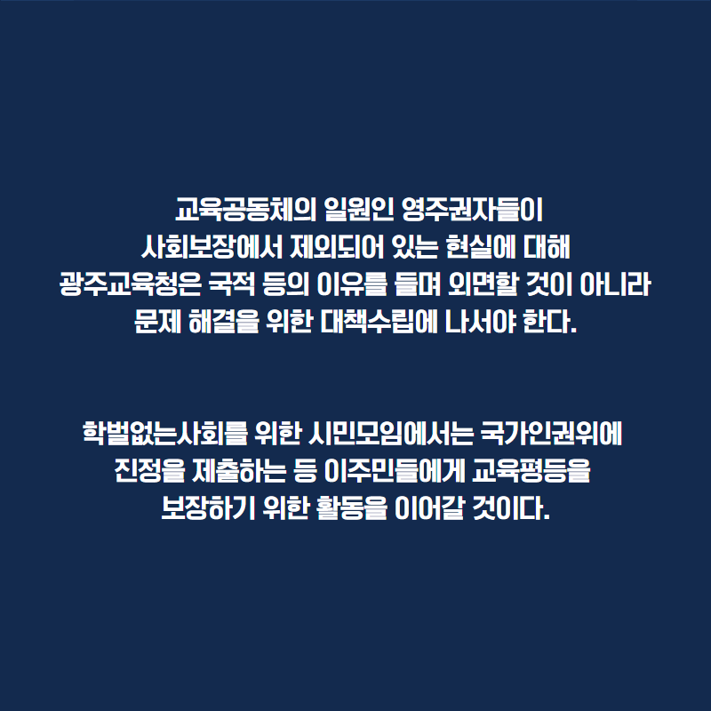 o 학벌없는사회를 위한 시민모임은 국내 영주권자, 임시비자소지자(이하, 국내 영주권자 등)를 유아 교육비 지원 대상에서 배제하는 것은 합리적인 이유가 없는 평등권 침해의 차별이라고 판단�