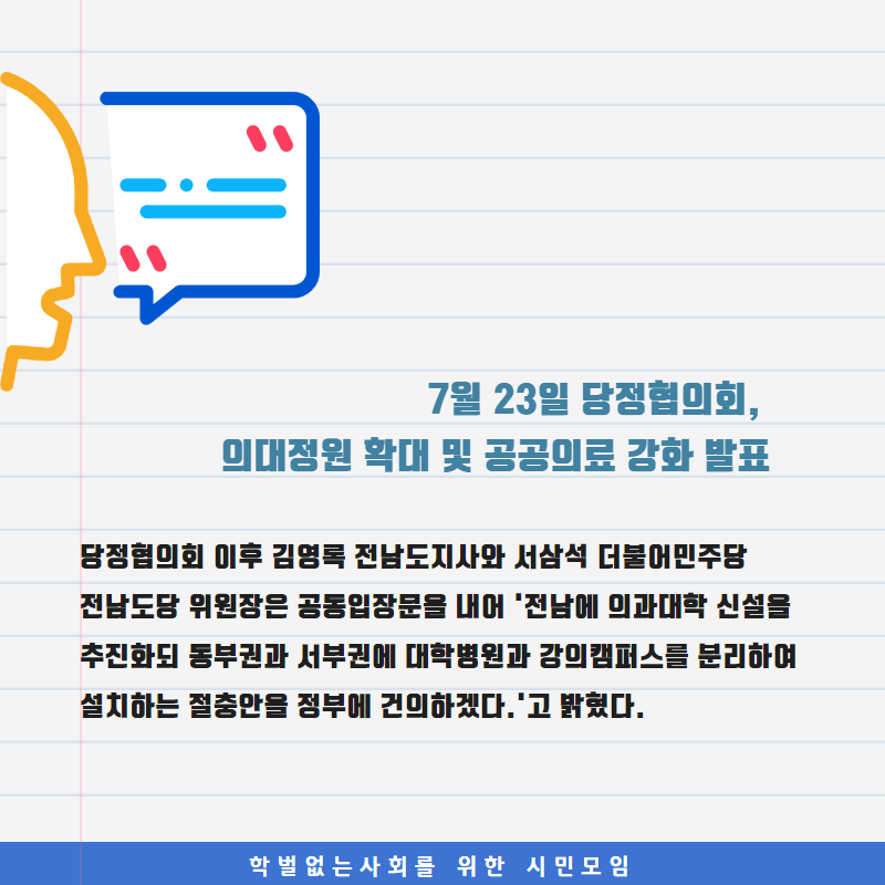 - 무게중심은 ‘의대’가 아니라 ‘공공의료’이다.- ○ 7월 23일, 정부와 여당은 당정협의회를 통해 의대 정원을 늘려서 공공의료를 보강하는 방안을 발표했다. 정부는 2022학년도부터 10년간 의�