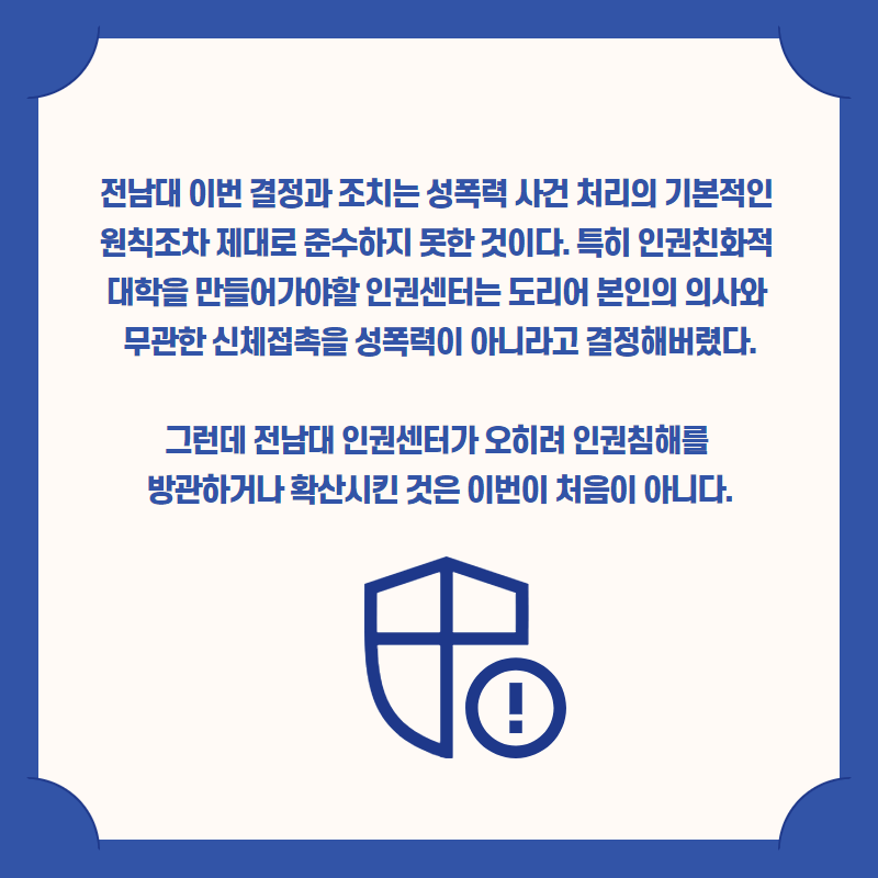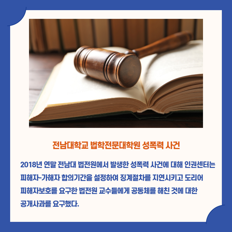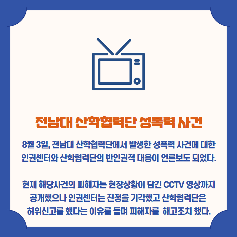 ○ 8월 3일, 전남대학교에서 발생한 성폭력 사건에 대한 전남대 인권센터의 반인권적 대응이 언론에 보도되었다. 보도에 따르면 2020년 1월 전남대 인권센터는 2019년 12월 전남대 산학협력단 직원�
