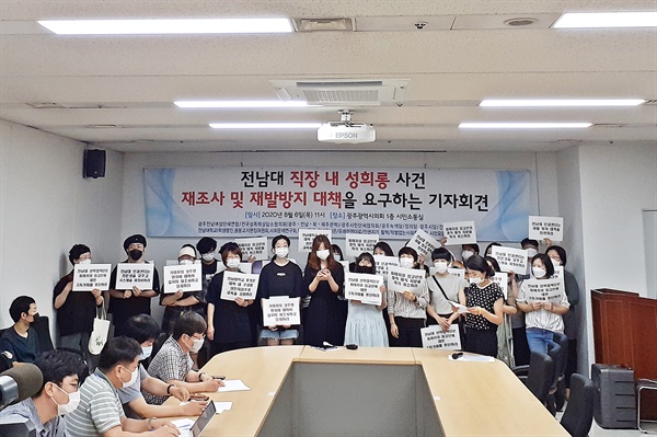 2020. 8. 6. 학벌없는사회를 위한 시민모임 등 11개 단체가 전남대학교 산학협력단에서 발생한 성추행 사건 규탄 기자회견을 열고 재조사와 재발방지 대책을 요구하였습니다. 향후 교육부 조사결과가 나올 시 공유하고 적극 연대해나가겠습니다.