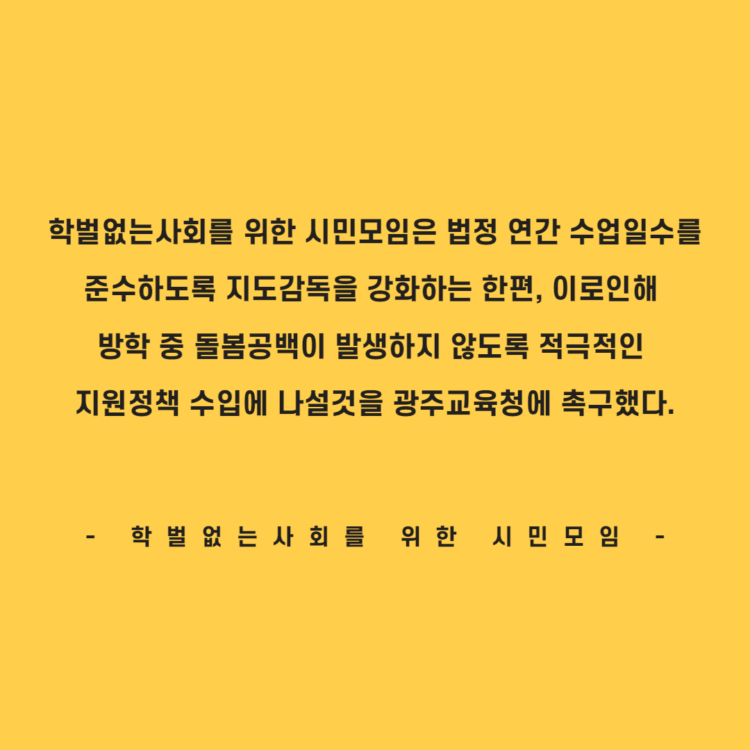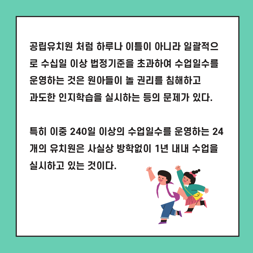 학벌없는사회를 위한 시민모임이 유치원 알리미에 공개한 2019년 광주지역 공·사립 유치원 데이터를 분석한 결과, 대부분의 사립유치원이 법정 연간 수업일수를 초과해가며 원아들의 인권을 침