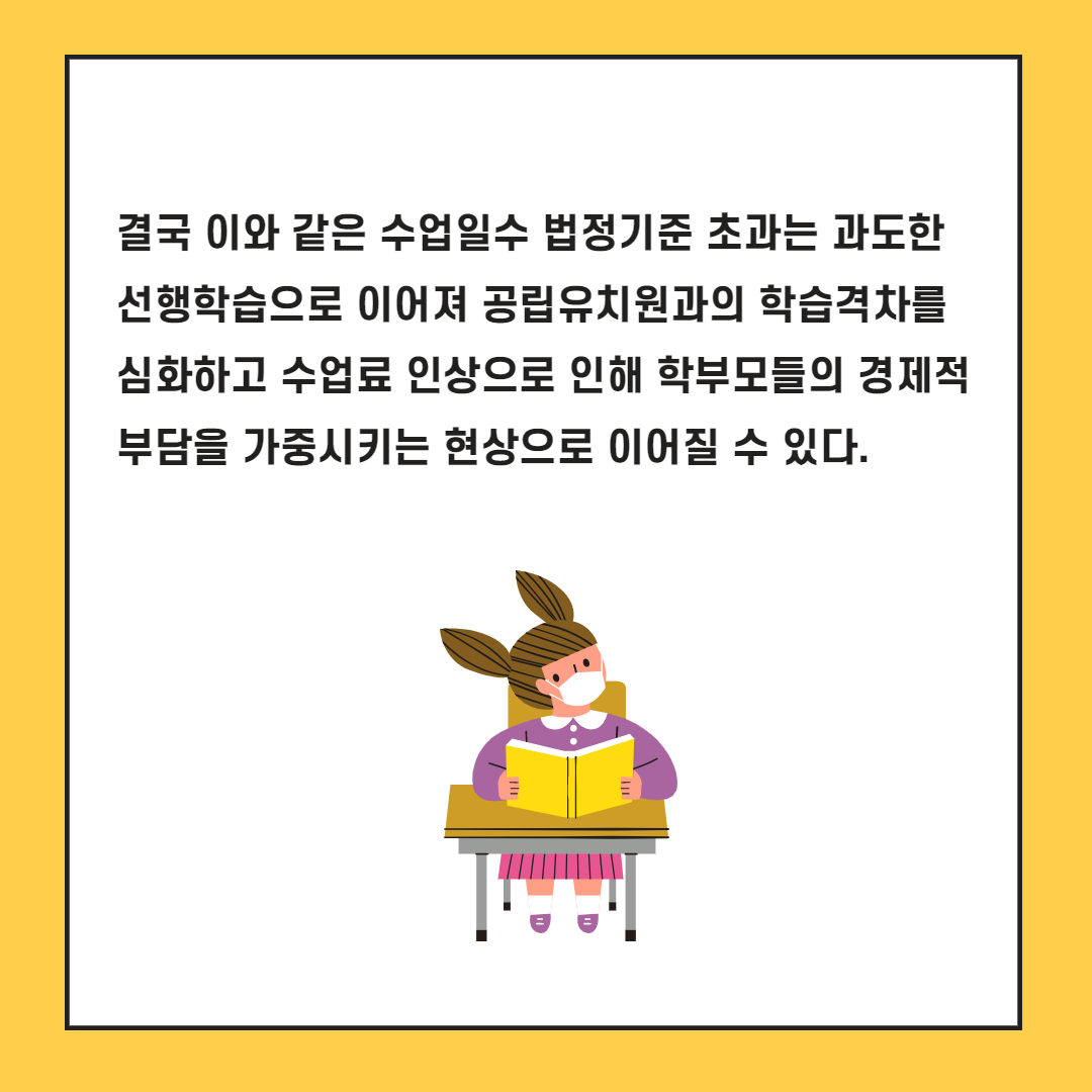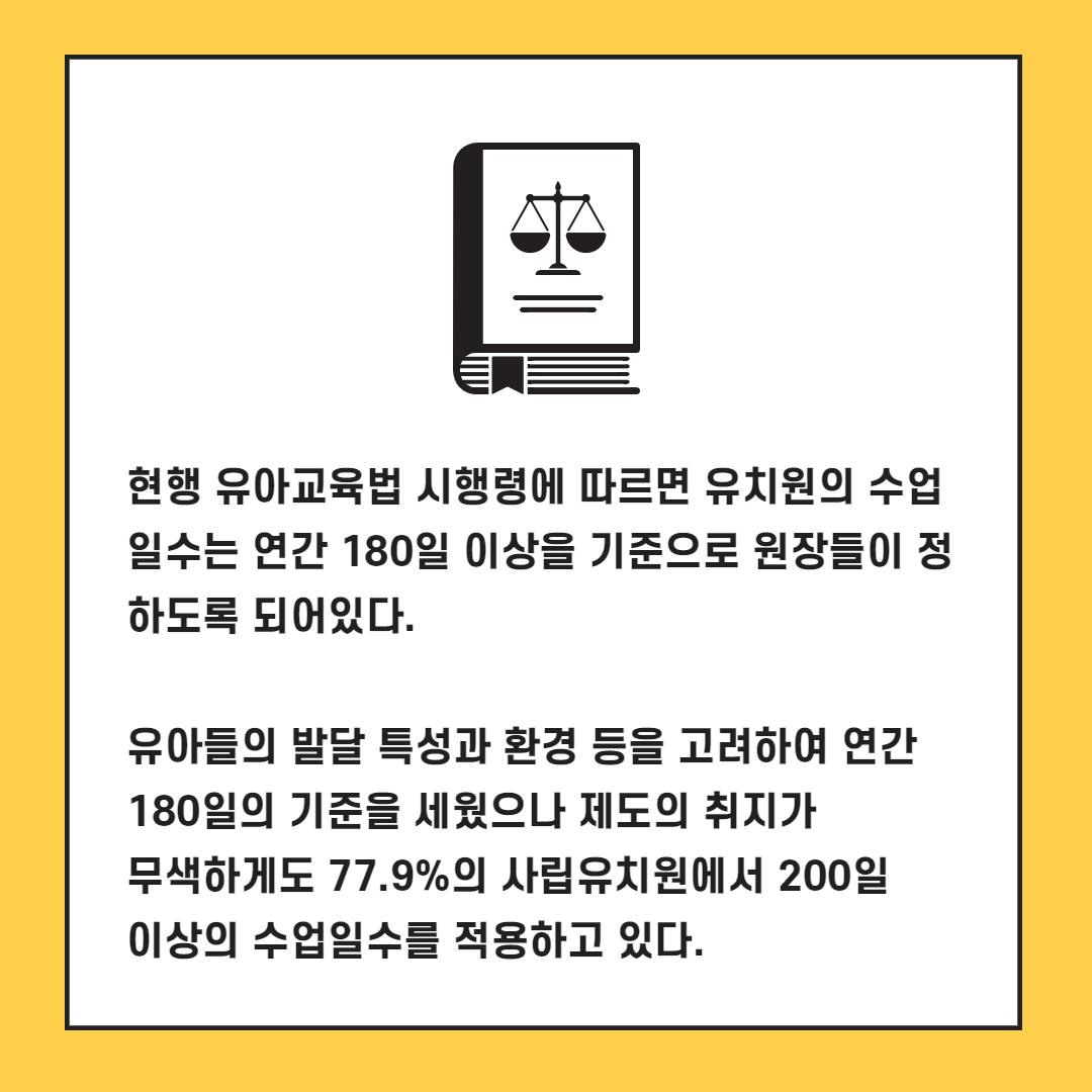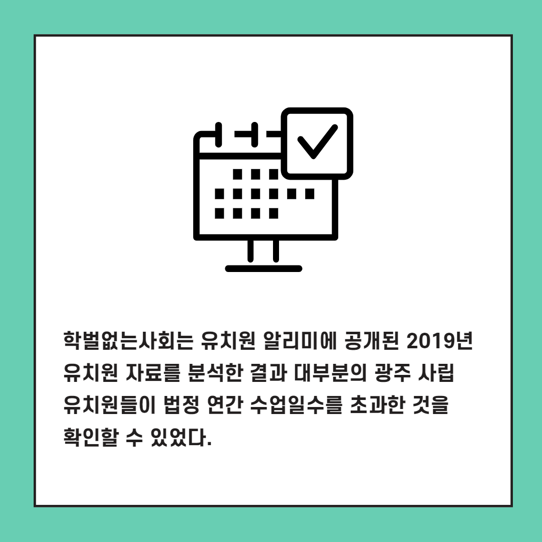 학벌없는사회를 위한 시민모임이 유치원 알리미에 공개한 2019년 광주지역 공·사립 유치원 데이터를 분석한 결과, 대부분의 사립유치원이 법정 연간 수업일수를 초과해가며 원아들의 인권을 침