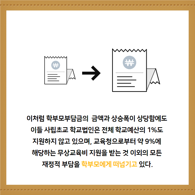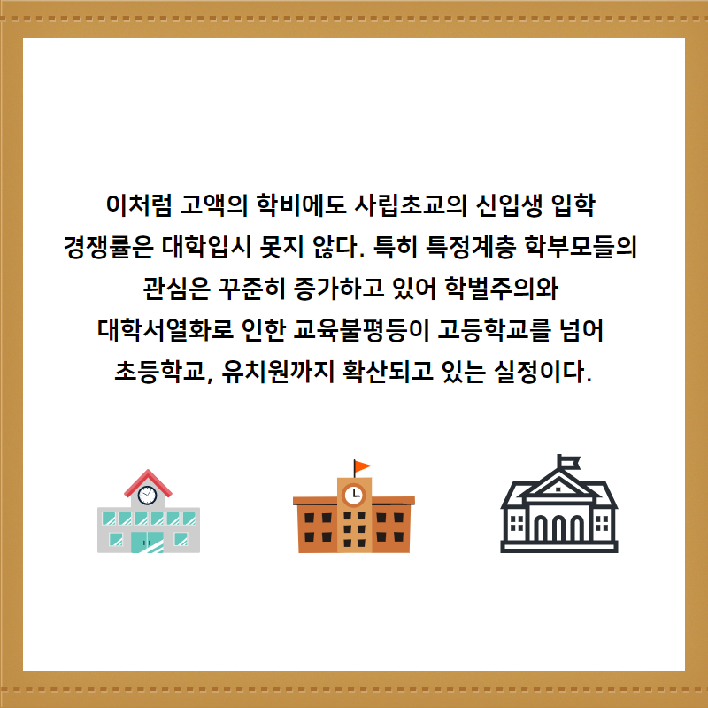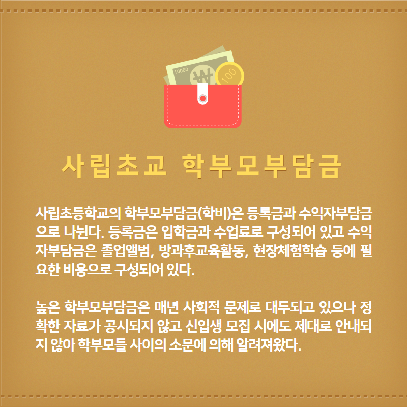 사립초등학교의 높은 학부모부담금(학비)이 매년 사회적 문제로 대두되고 있음에도, 학교가 자발적으로 정보 공시하거나 신입생 모집 시 세부적으로 안내하지 않아 학부모들 사이의 쪽지 정보�