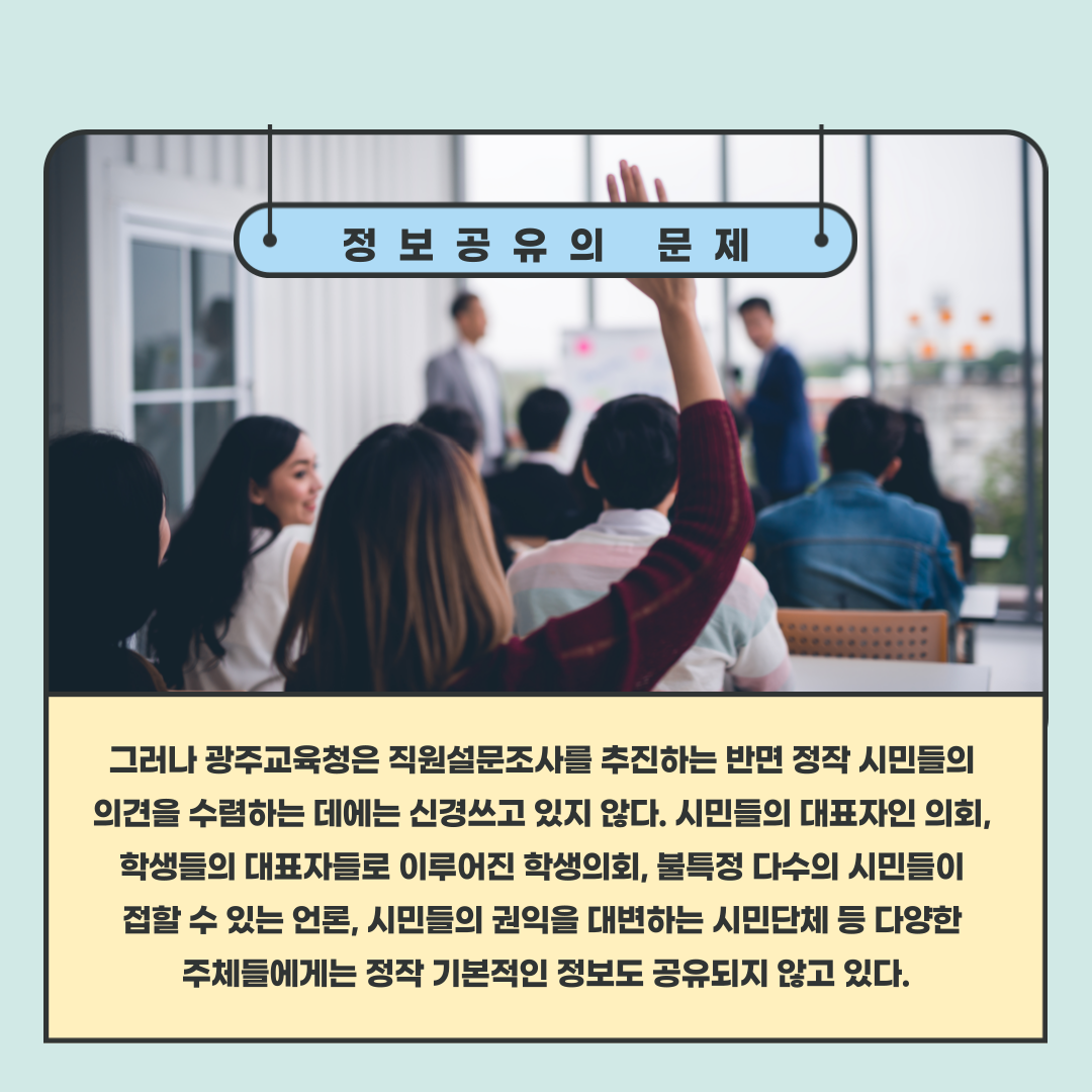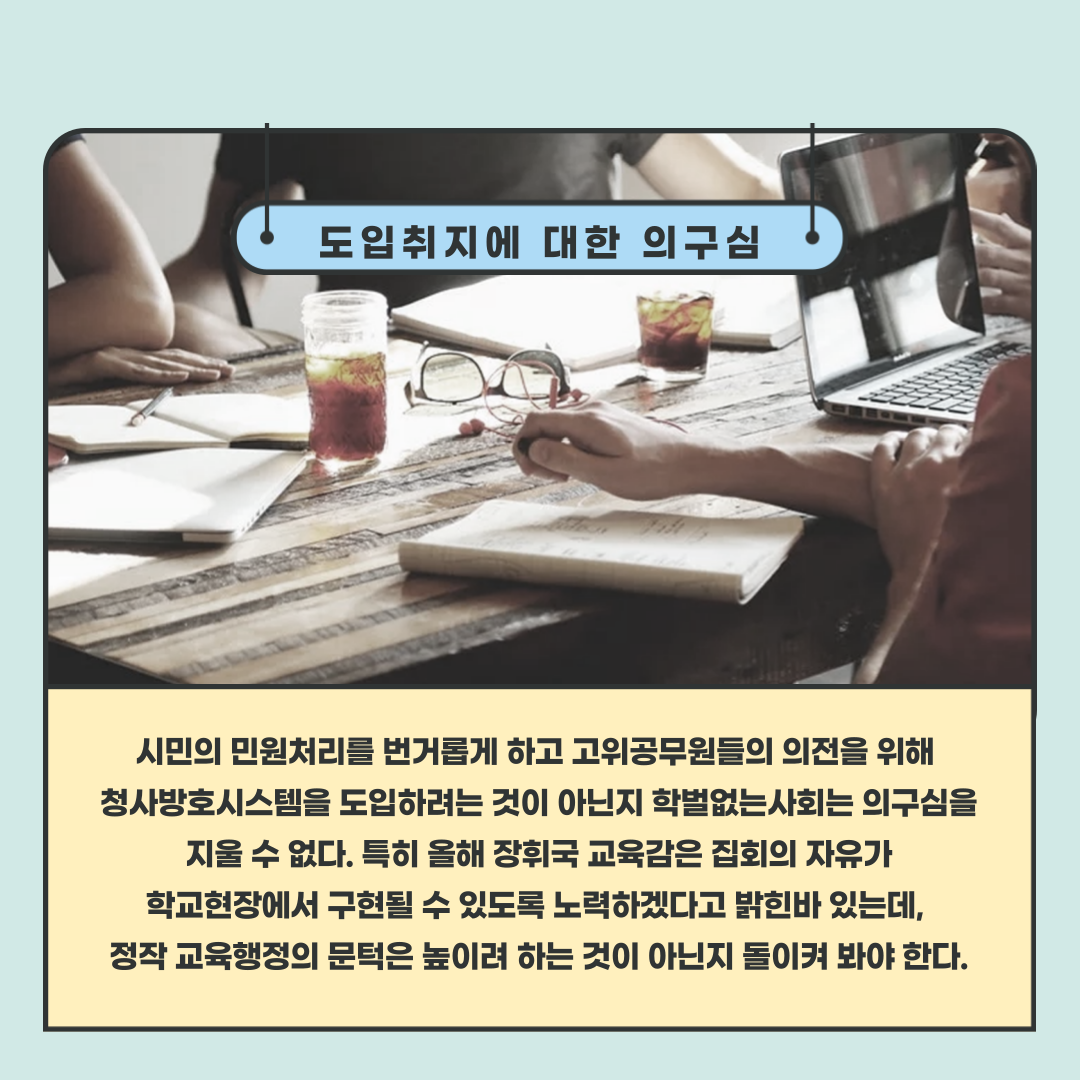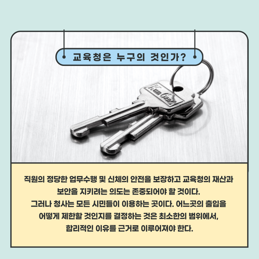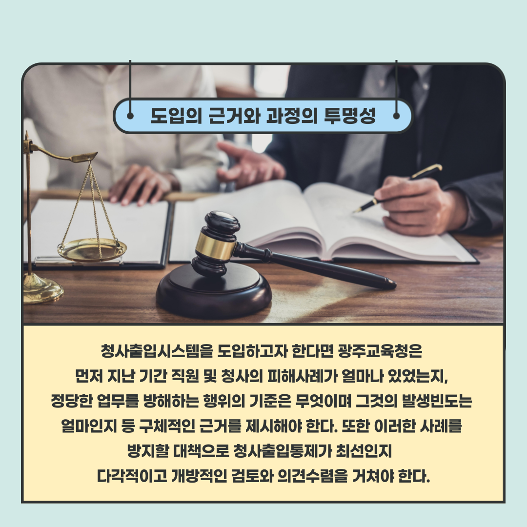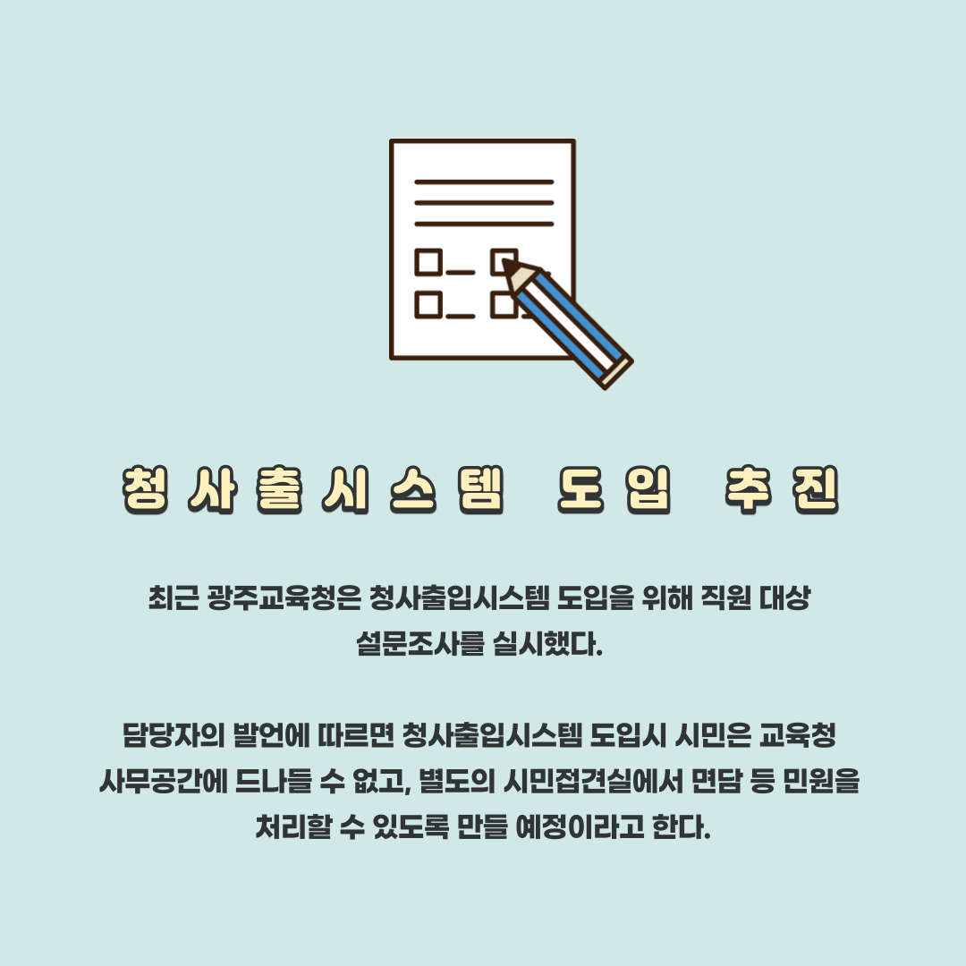 ○ 최근 광주광역시교육청은 청사출입시스템 도입을 위해 직원 설문조사를 진행하였다. 청사방호 담당자 발언에 따르면, 청사출입시스템 도입 시 시민은 교육청 사무공간에 드나들 수 없고, 별