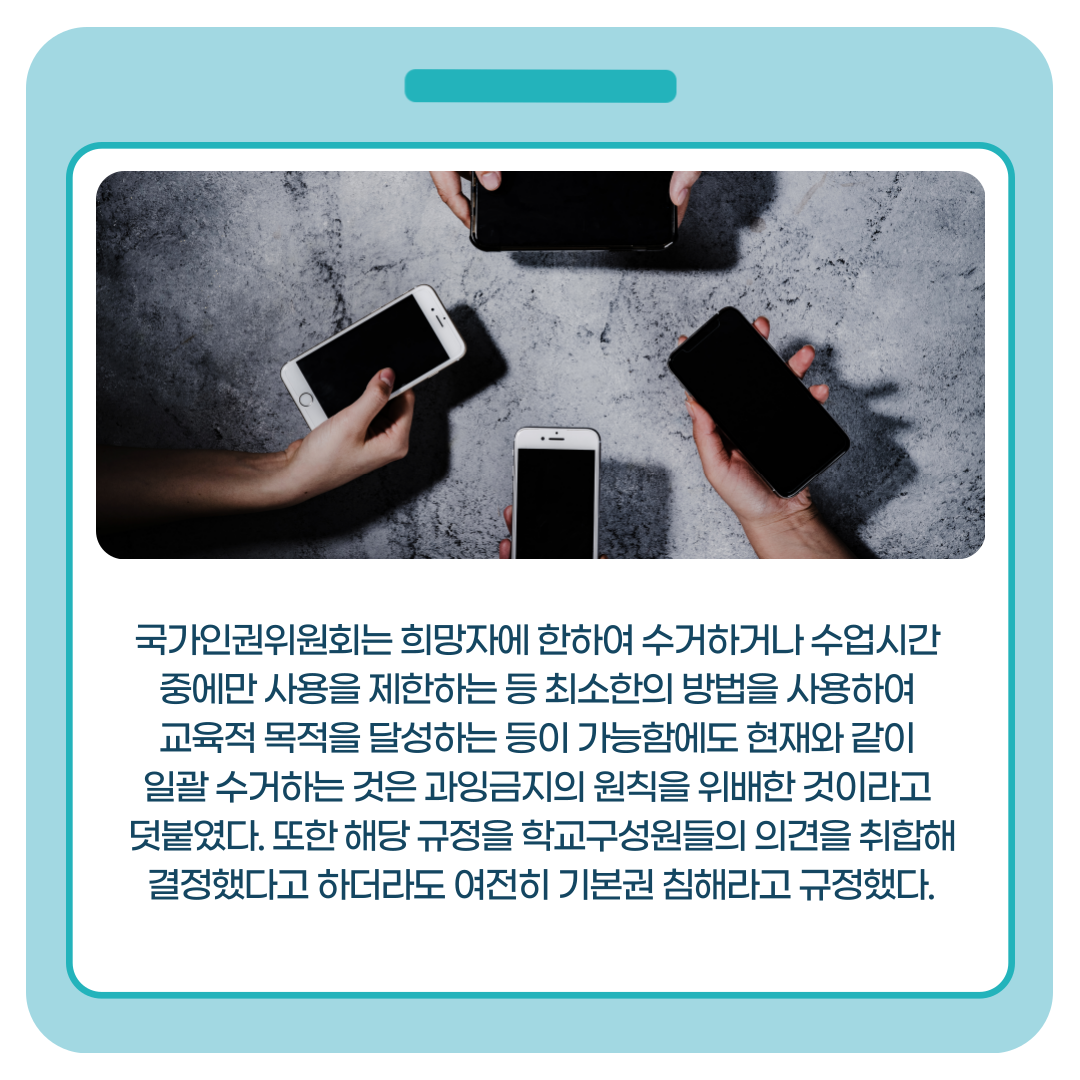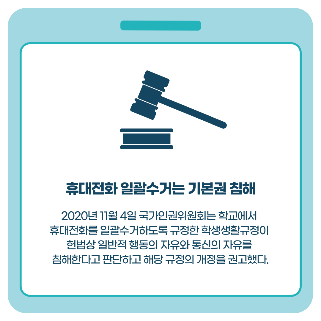 ○ 최근 국가인권위원회는 ‘학생들의 휴대전화를 등·하교시간에 일괄 수거·반환하는 학생생활규정’이 헌법상 일반적 행동의 자유와 통신의 자유를 침해한다고 판단하여, 일선 중·고등학교