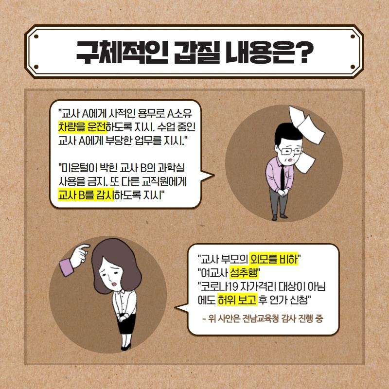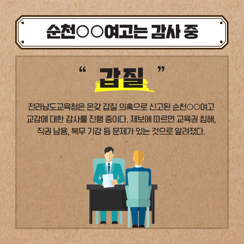 ○ 최근 전라남도교육청이 온갖 갑질과 부조리 의혹으로 신고된 순천○○여고 교감에 대한 감사를 진행 중이다. 학벌없는사회를 위한 시민모임은 엄정하고 철저한 감사를 촉구하는 바이다. ○