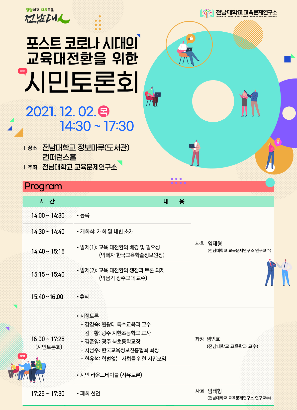 ○ 발제 : 교육 대전환의 배경 및 필요성 (박혜자 학국교육학술정보원장), 교육 대전환의 쟁점과 토론 의제 (박남가 광주교육대학교 교수)