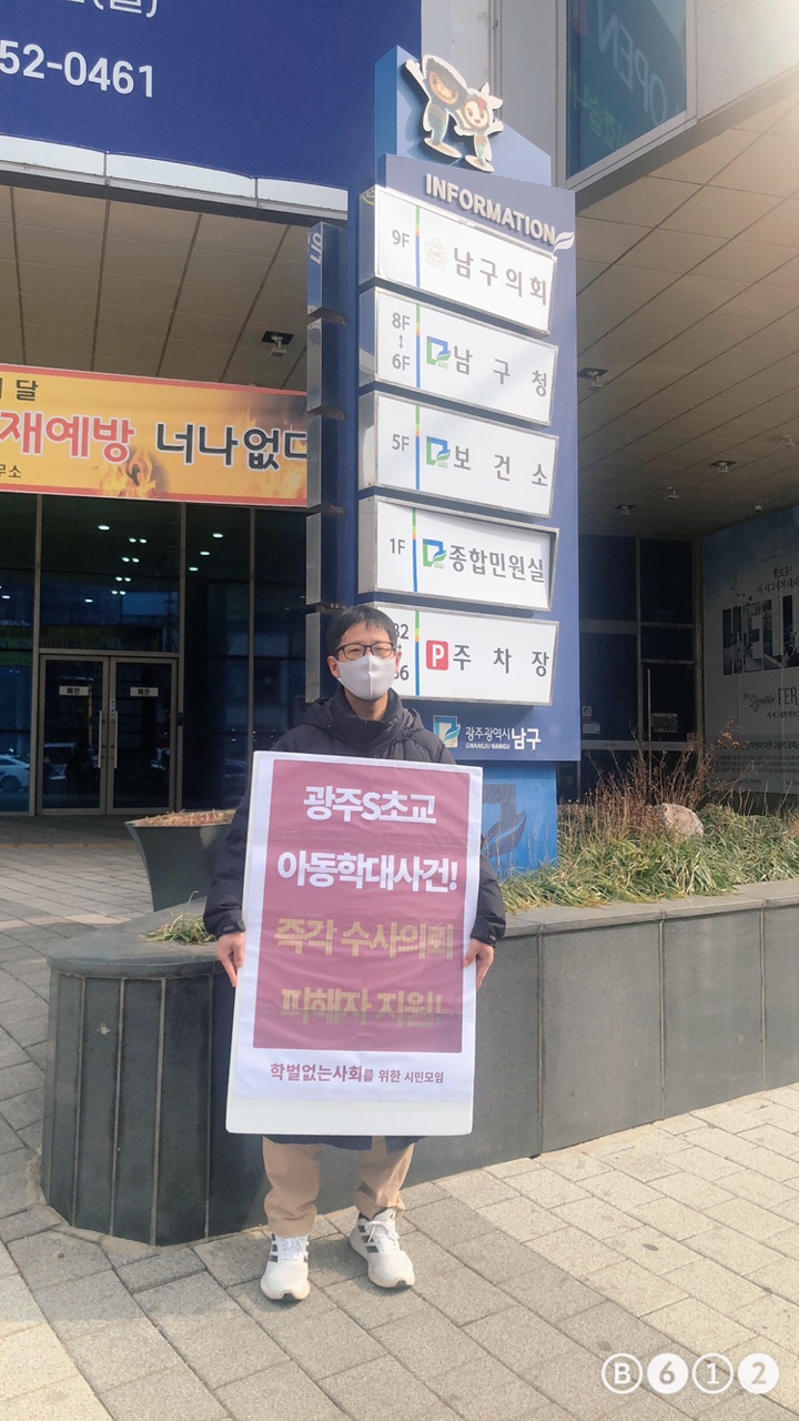 상·벌점 제도에 의해 초등학교 1학년생에게 명심보감을 수차례 걸쳐 필사하는 방식으로 교실 내 감금한 사건 알고 계신가요? 지난해 12월 논란이 된 광주S초교 아동학대 의심 신고를 한 지 보름이 훌쩍 넘었습니다. 그럼에도 신고를 받은 광주남구청과 광주남부경찰서는 추가 조사를 한다는 명분으로 아동학대 판정을 연기하고 있습니다. 이에 지체 없이 조사를 하여 해당 학교 관계자를 수사의뢰하고 피해자를 구제해 줄 것을 일인시위를 통해 촉구했습니다. 이 일인시위는 2022. 1. 24.부터 조사 결과가 나올 때까지 진행할 예정이니, 많은 회원님들의 참여와 관심을 부탁드립니다.