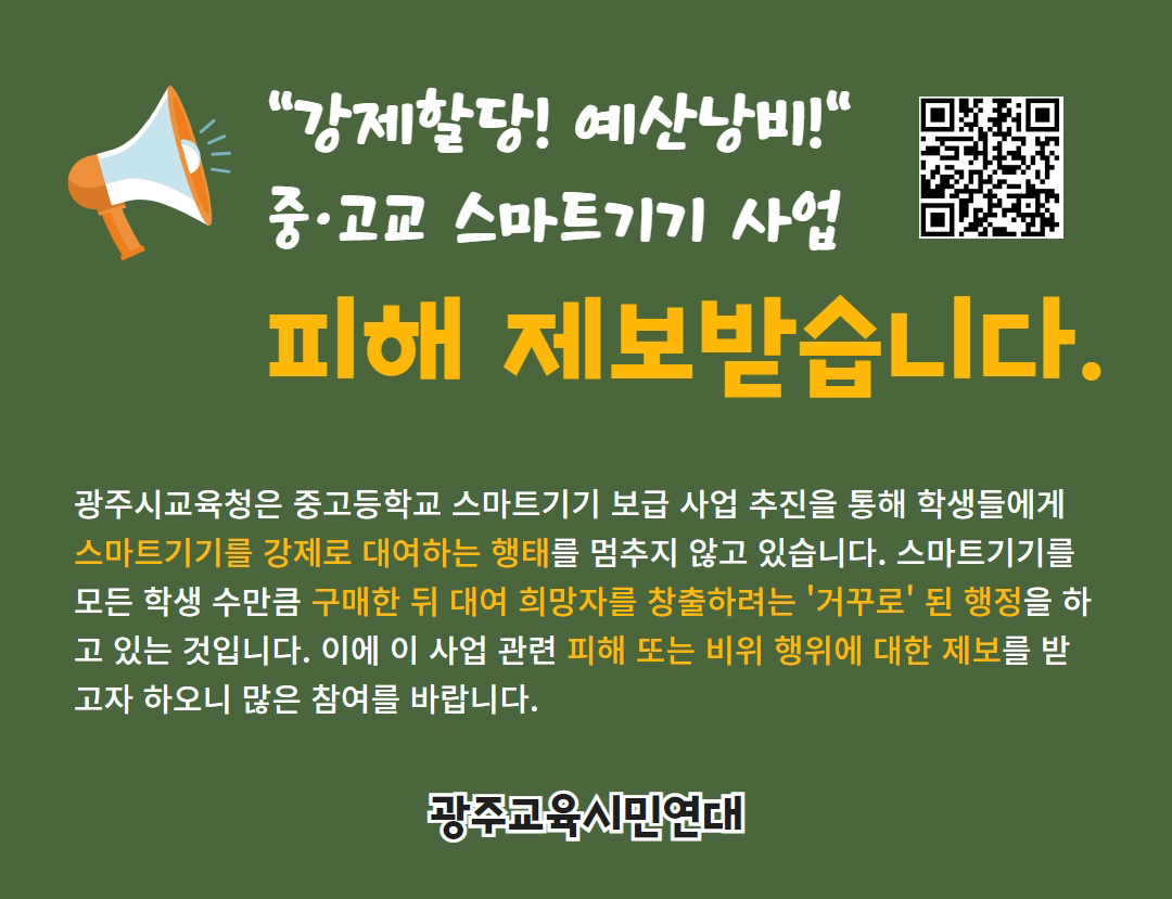 광주시교육청은 중고등학교 스마트기기 보급 사업 추진을 통해 학생들에게 스마트기기를 강제로 대여하는 행태를 멈추지 않고 있습니다. 스마트기기를 모든 학생 수만큼 구매한 뒤 대여 희망자를 창출하려는 '거꾸로' 된 행정을 하고 있는 것입니다. 이에 이 사업 관련 피해 또는 비위 행위에 대한 제보를 받고자 하오니 많은 참여를 바랍니다.