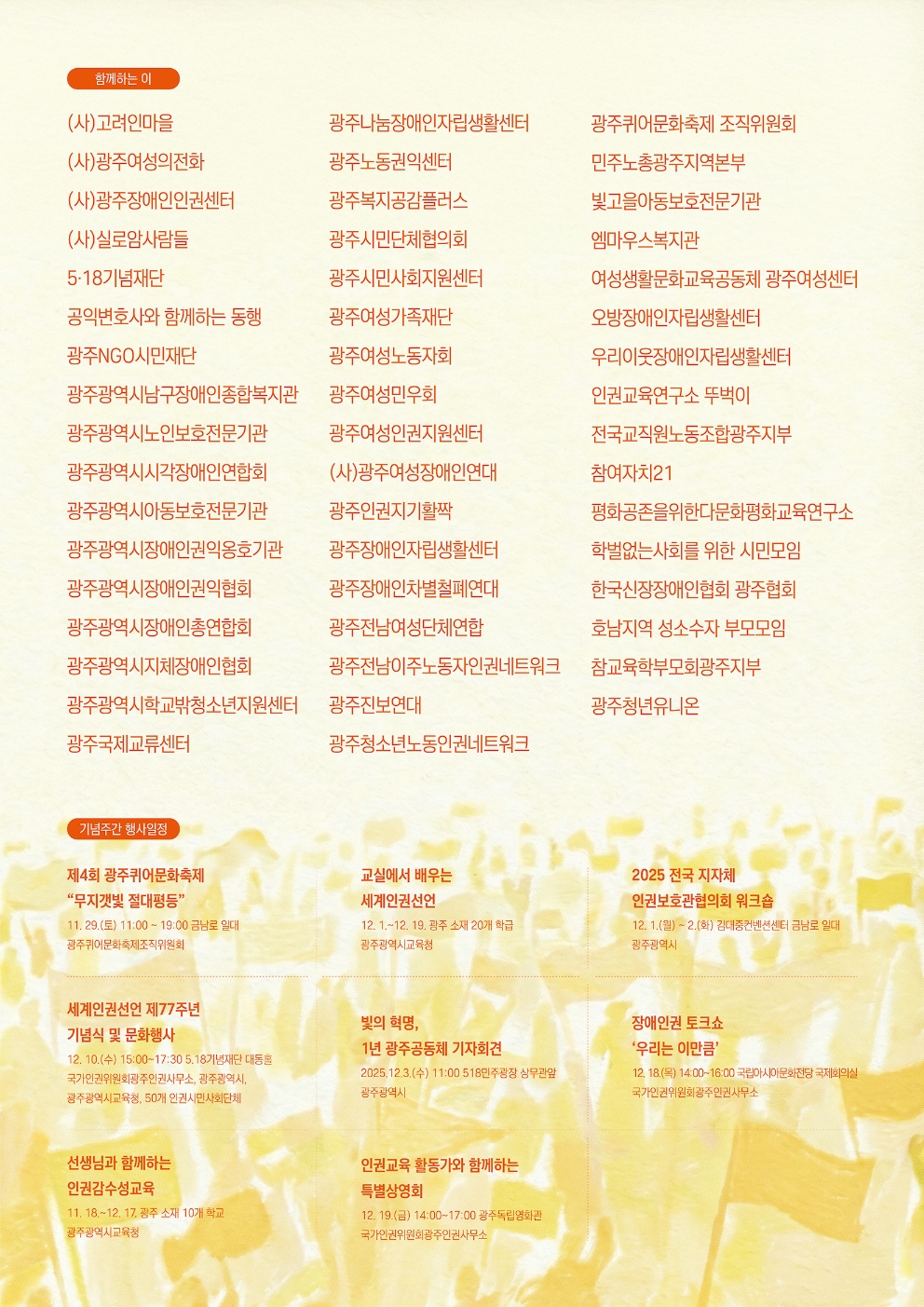 - (사) 고려인마을, (사)광주여성의전화, (사)광주장애인인권센터, (사)실로암사람들, 5·18기념재단, 공익변호사와 함께하는 동행, 광주NGO시민재단, 광주광역시남구장애인종합복지관, 광주광역시노인보호전문기관, 광주광역시시각장애인연합회, 광주광역시아동보호전문기관, 광주광역시장애인권익옹호기관, 광주광역시장애인권익협회, 광주광역시장애인총연합회, 광주광역시지체장애인협회, 광주광역시학교밖청소년지원센터, 광주국제교류센터, 광주나눔장애인자립생활센터, 광주노동권익센터, 광주복지공감플러스, 광주시민단체협의회, 광주시민사회지원센터, 광주여성가족재단, 광주여성노동자회, 광주여성민우회, 광주여성인권지원센터, (사)꽝주여성장애인연대, 광주인권지기활짝, 광주장애인자립생활센터, 광주장애인차별철폐연대, 광주전남여성단체연합, 광주전남이주노동자인권네트워크, 광주진보연대, 광주청소년노동인권네트워크, 광주퀴어문화축제 조직위원회, 민주노총광주지역본부, 빛고을아동보호전문기관, 엠마우스복지관, 여성생활문화교육공동체 광주여성센터, 오방장애인자립생활센터, 우리이웃장애인자립생활센터, 인권교육연구소 뚜벅이, 전국교직원노동조합광주지부, 참여자치21, 평화공존을위한다문화평화교육연구소, 학벌없는사회를 위한 시민모임, 한국신장장애인협회 광주협회, 호남지역 성소수자 부모모임, 참교육학부모회광주지부, 광주청년유니온