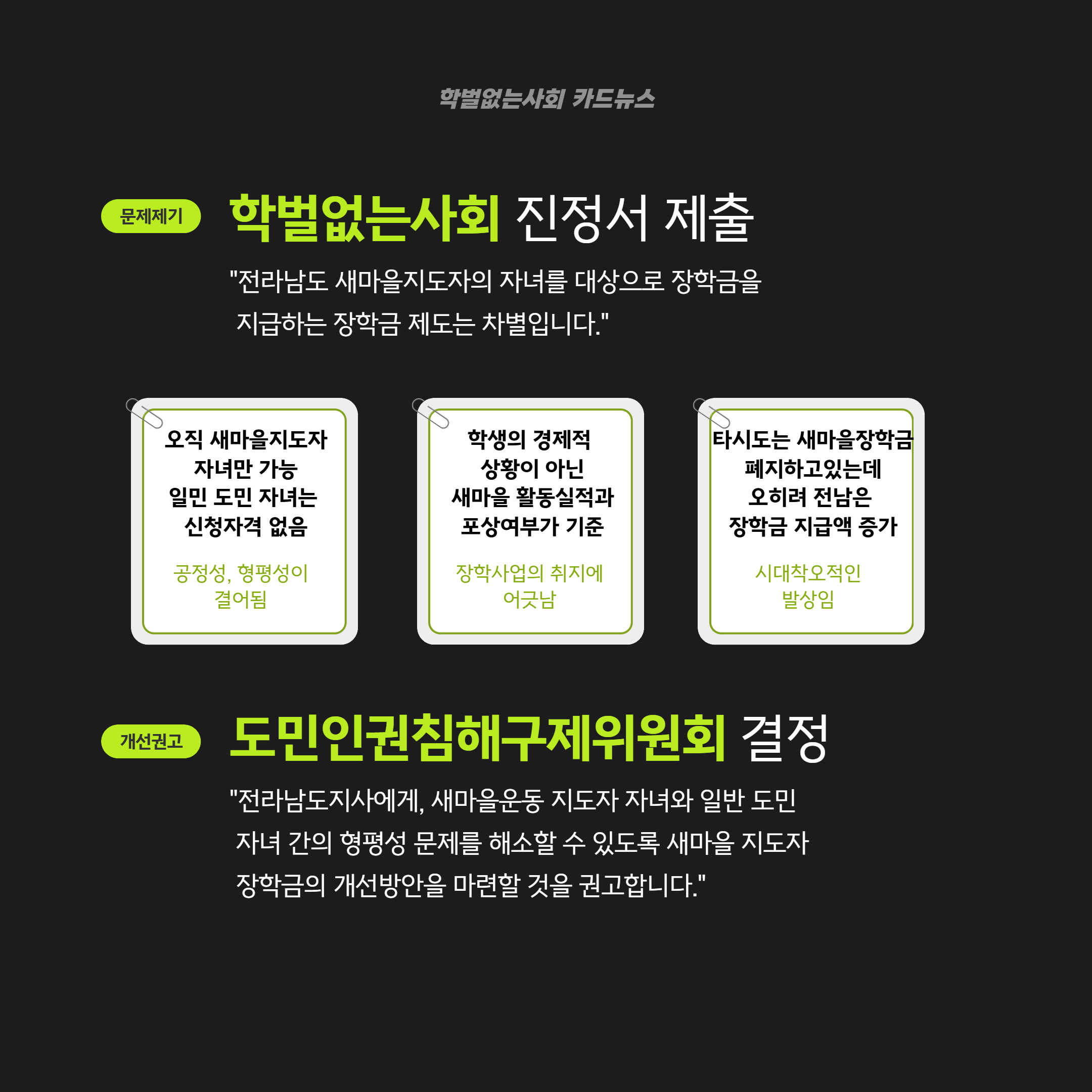 우리 단체는 이정선 교육감이 이번 사안에 대해 즉시 시민들에게 공개적으로 사과하고, 해명할 것을 촉구한다. 또한 광주광역시선거관리위원회는 본 사안을 신속하고 철저하게 조사하여 위법이 발견된다면 사법처리를 해야 한다.