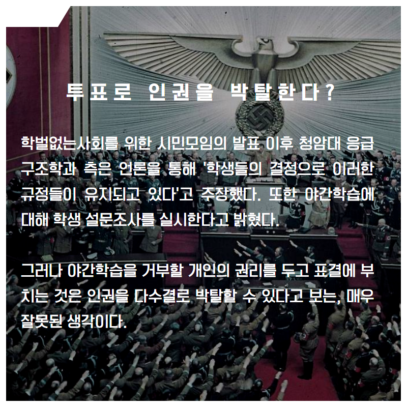 학생은 이른바 '강제 야자' 외에도 주름과 각을 잡은 제복 착용, 학습 중 휴대전화 수거 등 인권 침해 소지를 들춰냈다.