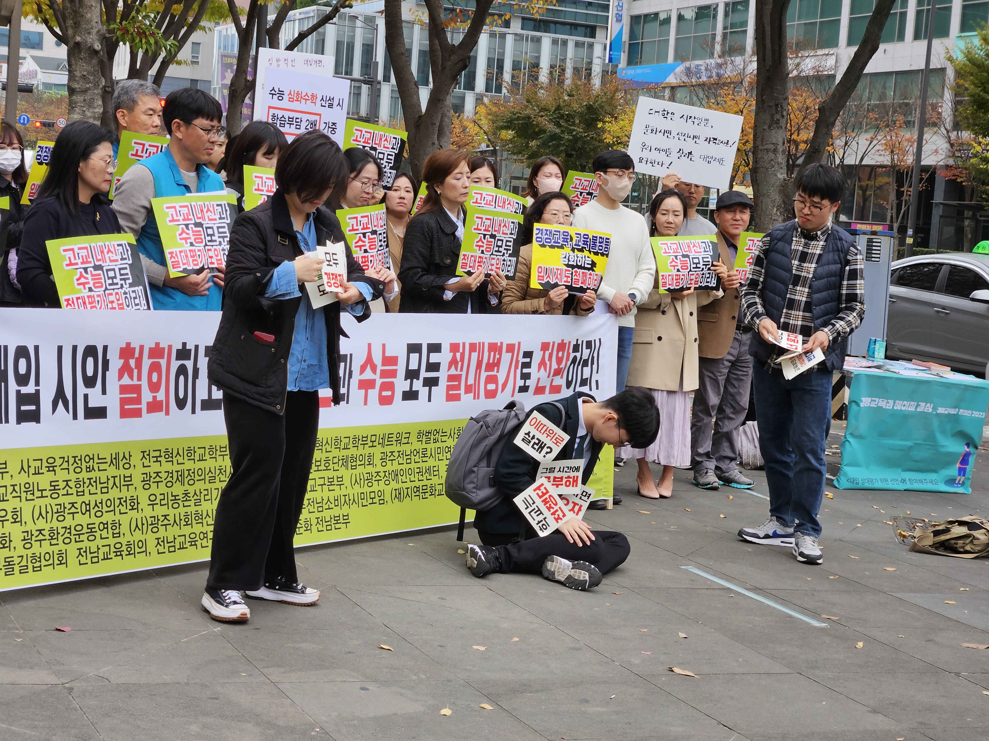 2028 대입 시안 철폐 촉구를 위해 전남광주 및 전국의 48개 교육․시민단체는 오늘(11월 9일 목요일) 오후 1시, ‘2028 대학입시제도 개편 시안 학부모 설명회’가 열리는 라마다플라자광주에서 교육부 2028 대입 시안 철폐를 촉구하는 기자회견을 갖게 되었습니다. 교육부는 지난 10월 10일에 ‘고교내신 5등급 상대평가’, ‘수능 상대평가 현행 유지(국어,수학,사‧과탐 상대평가) 및 통합형과목 체제로 개편’, ‘심화 수학(미적분2+기하) 신설 검토’를 주요 내용으로 한 2028 대입 개편시안을 발표하고 10월 25일에는 대전에서, 10월 30일에는 서울에서 학부모 설명회를 개최했습니다. 우리는 이 시안의 확정 시 고교학점제 무력화, 사교육 폭증, 경쟁교육 고통 심화 등을 심히 우려하며 교육부의 2028 대학입시제도 개편시안 학부모 설명회에 참석하고 있습니다. 그러나 교육부의 설명회를 비롯한 여론 수렴 과정을 면밀히 모니터링한 결과 교육부가 2028 대입의 향방을 확정짓는 중요한 논의에 당사자 및 국민들의 의견을 제대로 반영하거나 귀 기울이고자 하는 절차나 의지가 있는지 심히 우려됩니다. 이에 48개 단체는 교육부 설명회 및 학부모 의견이라고 밝힌 설문조사 결과의 타당성과 정당성의 문제 그리고 2028 대입 개편 시안이 반드시 철회되어야만 하는 이유를 낱낱이 소개하고자 합니다.