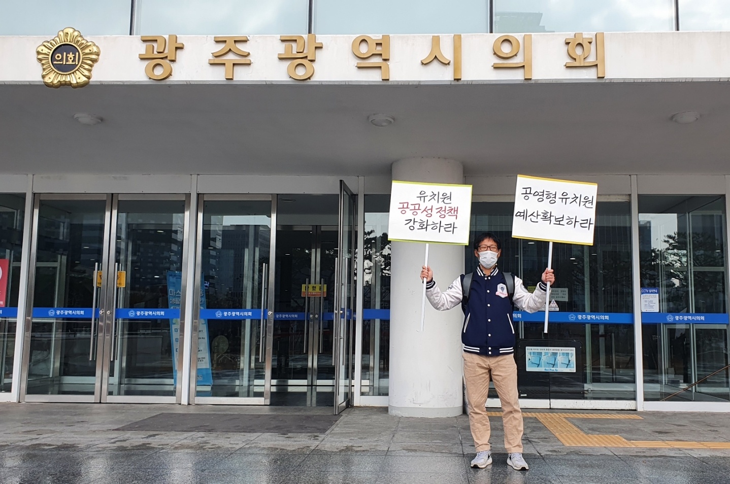 이달 초 광주시 시민권익위원회에서 공영형 유치원 사업 중단과 관련한 논의를 진행합니다. 같은 시기, 광주광역시의회는 내년도 광주시교육청 본 예산(공영형 유치원 사업 예산 전액 삭감)을 심의하고요. 이에 광주시의회 정문 앞에서 시위를 진행해 해당 사업 지속을 촉구하고 나섰습니다. 일인시위는 예산심의일인 12월 10일까지 진행하오니 많은 관심과 참여 부탁드립니다.