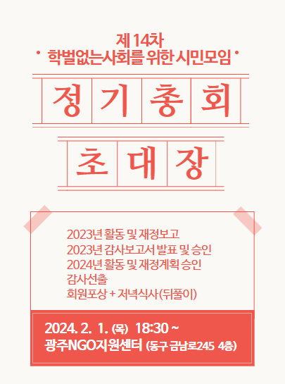 ○ 일시 : 2024. 2. 1.(목) 18:30~, 광주NGO지원센터 시민마루(동구 금남로245 4층)