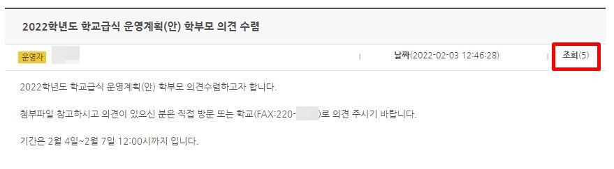 ▲ 광주M초등학교 홈페이지 내 학교급식 학부모 의견수렴 안내 (조회수 : 5회)