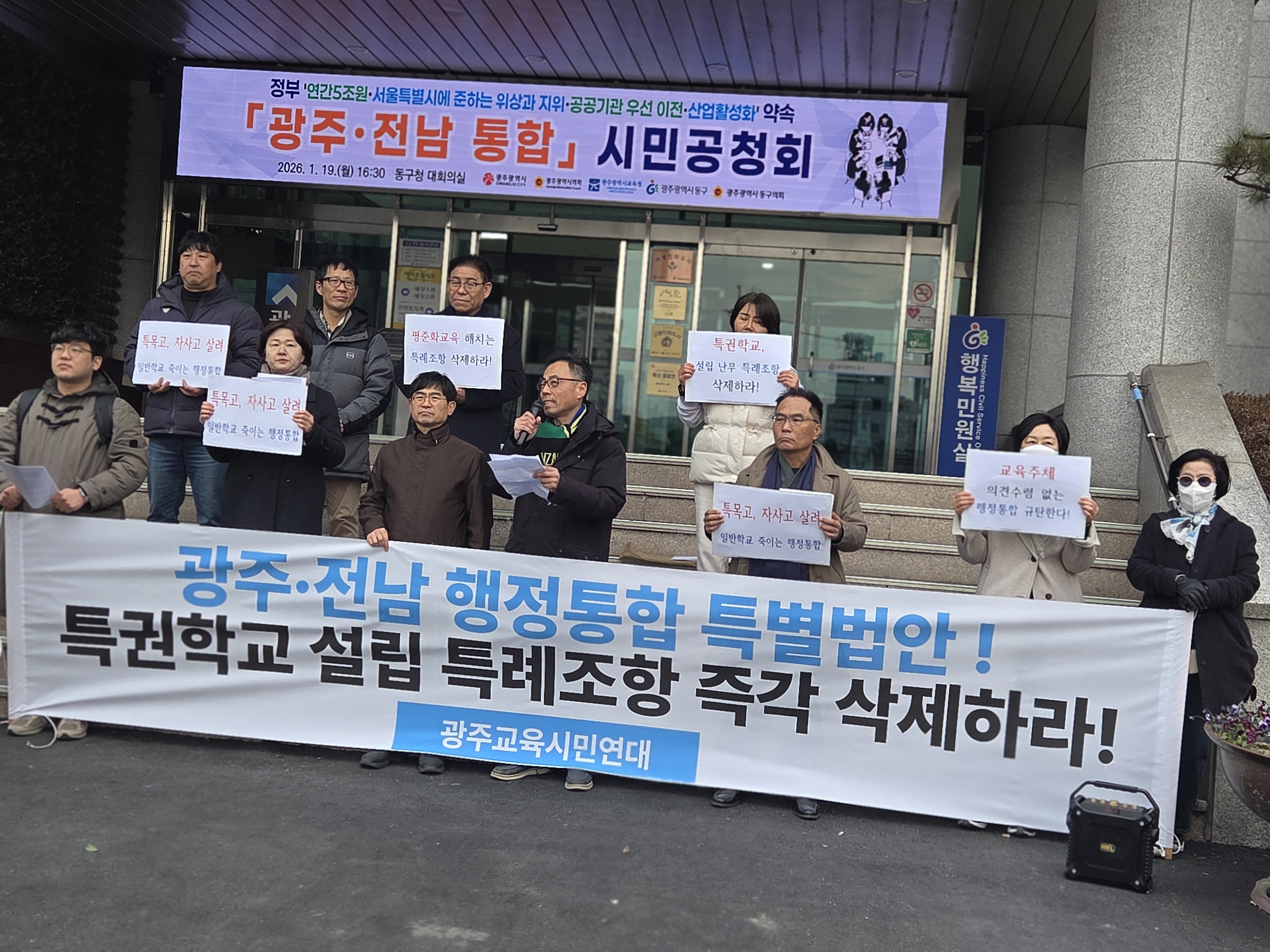 2026년 1월 19일, 광주광역시 동구청에서 행정통합 공청회가 열렸다. 광주교육시민연대는 규탄 회견을 한다. 행정통합 논의가 한창이다. 목적지, 도착시간, 포상금을 못 박고 몰아가니 정신이 없다.