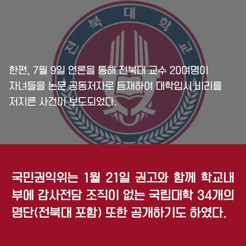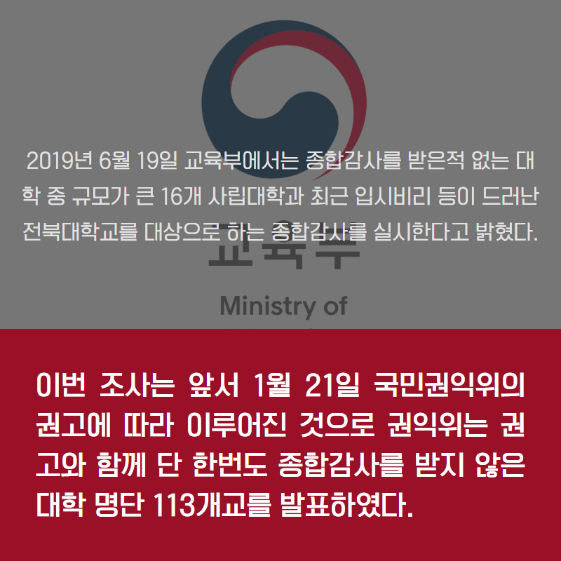 각종 매체/카드뉴스 [카드뉴스] 16개 사립대 및 전북대 종합감사 실시 - 관리자 2019. 8. 9. 11:59 [보도자료] 교육부는 사립대 종합감사 계획 확대하고국공립대 회계·행정 개혁해야 한다.https://antihakbul.jinbo.net/3097?category=669012 [보도자료] 교육부는 사립대 종합감사 계획 확대하고국공립대 회계·행정 개혁해야 한다. [보도자료] 교육부는 사립대 종합감사 계획 확대하고 국공립대 회계·행정 개혁해야 한다. 교육부, 개교 이후 종합감사 미실시 대학 113개 중 16개 대학 종합감사 실시 개교이후 종합감사 미실시 대학 113개.. antihakbul.jinbo.net
