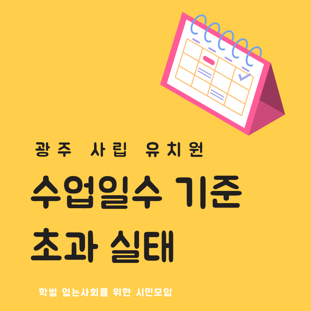 각종 매체/카드뉴스 [카드뉴스] 광주사립유치원 수업일수 기준 초과 실태 - 관리자 2020. 9. 18. 14:00 [보도자료] 광주 사립유치원, 법정 연간 수업일수 초과 ‘만연’ https://antihakbul.jinbo.net/3736?category=669012 [보도자료] 광주 사립유치원, 법정 연간 수업일수 초과 ‘만연’ 학벌없는사회를 위한 시민모임이 유치원 알리미에 공개한 2019년 광주지역 공·사립 유치원 데이터를 분석한 결과, 대부분의 사립유치원이 법정 연간 수업일수를 초과해가며 원아들의 인권을 침 antihakbul.jinbo.net