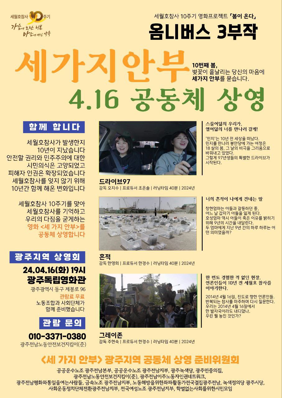 세월호참사 10주기를 맞아, 세월호참사를 기억하고 우리의 다짐을 굳게하는 영화 <세 가지 안부>를 공동체 상영합니다.